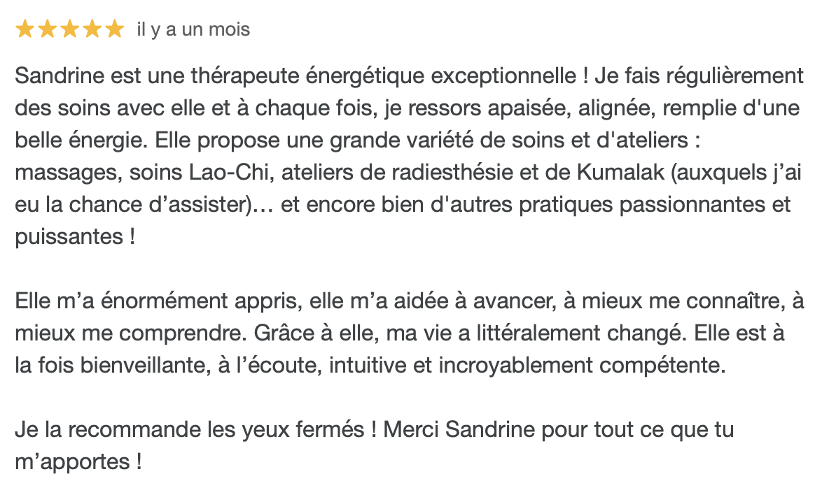 Lors de mes accompagnements, je ne cherche pas à “faire à votre place”, mais à vous aider à retrouver votre propre pouvoir d’auto guérison. L’énergie vitale circule naturellement en chacun de nous; parfois elle se bloque ou s’affaiblit sous l’effet du stress, des blessures émotionnelles, des croyances limitantes ou d’un rythme de vie déconnecté de nos besoins profonds. Mon rôle est de vous aider à réharmoniser cette énergie, à libérer les blocages et à reconnecter votre essence.